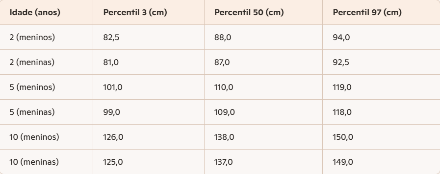 - Percentil 50: representa a mediana, ou seja, metade das crianças está acima e metade abaixo desse valor.