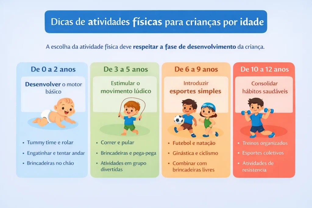 A escolha da atividade física deve respeitar a fase de desenvolvimento da criança. Cada faixa etária apresenta necessidades específicas do ponto de vista motor, cognitivo e metabólico. A seguir, apresento atividades alinhadas com cada faixa etária infantil.